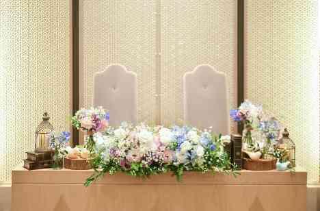 専属フローリストと打ち合わせして決めたおふたりだけの高砂装花♡ 淡い紫や水色を用いたコーディネートは会場の雰囲気にもぴったりで、ナチュラルな雰囲気とアンティークな小物づかいがお洒落で可愛い仕上がりに! ゲストの皆様からも「可愛い!」と沢山のお声をいただき…高砂でのお写真撮影が一層華やかになりました!