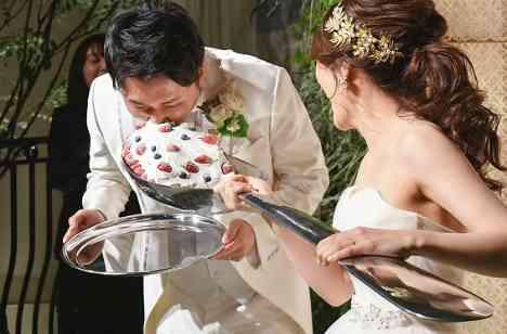 インフィニート名古屋のガーデンテラスにてファーストバイトのセレモニーを行いました。お顔が埋まってしまう程のビックスプーンが登場し、ゲストの皆様からも大歓声です♪ 愛情たっぷりサイズのケーキとお顔についた生クリームは、ゲストの皆様にインパクトを残したことは間違いなしです。 おふたりの仲睦まじい姿をご披露するにぴったりの演出となりました!