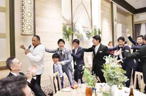 お色直し入場後、突然現れた外国人シンガーにゲストの皆さんはびっくり。圧倒的な歌声に会場は大盛り上がり!新郎やゲストがシンガーの後ろについて、一緒に歌いながら踊るという、最高の時間になりました。新婦も立ち上がって大きな手拍子で盛り上がりました。