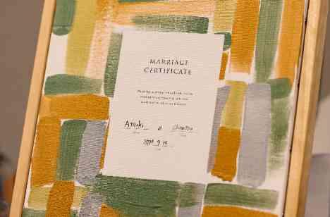 新郎新婦の結婚を証明するためにご準備いただいている結婚証明書。こちらのおふたりが結婚証明書に選んだのは「ウェディングキャンバス」!ゲスト全員にキャンバスに一筆ずつ色を入れていただき、挙式の際におふたりが署名をして披露!インテリアにもなるおしゃれなデザインで、世界にひとつだけの結婚証明書が完成しました♡