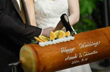 おふたりがウェディングケーキの代わりに選んだのは…見ごたえ抜群の巨大バームクーヘン!これだけでも珍しい演出ではございますが、更にゲストを驚かせたい!珍しい事がしたい!と、入刀用のナイフの代わりに斧をご準備いただいたおふたり。予想もしていなかったデザイン・演出にゲストの皆様もびっくり!大変盛り上がる演出となりました♪