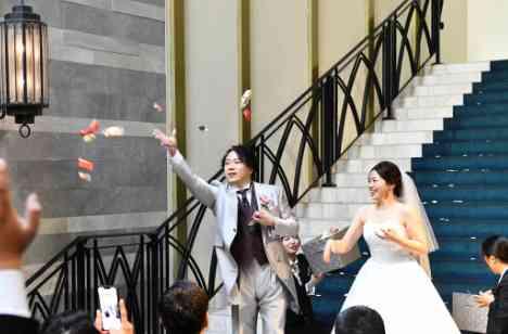 挙式が結び、披露宴までのお時間にもゲストの方におもてなしをしたい!というゲスト想いのおふたり。アフターセレモニーとして選んだのは、東海地方ならではの演出であるお菓子撒き!お菓子撒きというのは、新郎新婦がゲストに「幸せのおすそわけ」としてお菓子を撒くセレモニーのことです。老若男女問わず皆様に楽しんでいただける演出^^是非取り入れてみてはいかがでしょうか?