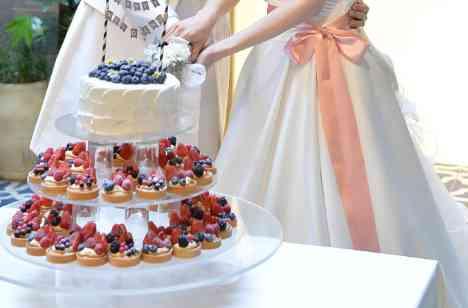 シンプルな真っ白いウエディングケーキの周りを彩るのは、カラフルなタルトケーキ。インフィニート名古屋の特徴でもあるブルータイルのガーデンにて、写真映え◎なお二人だけのオリジナルウエディングケーキとなりました。
