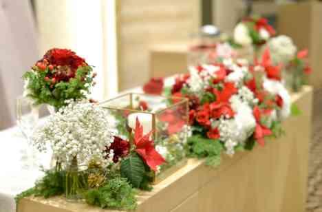 クリスマスをイメージして、キャンドルやポインセチアの装花を取り入れました。また、会場内にはクリスマスツリーやサンタさんグッツがゲストの皆様をお出迎え。披露宴会場オープンの瞬間には「可愛い!」と皆様から歓声が上がり、そこから写真撮影大会が始まりました。
