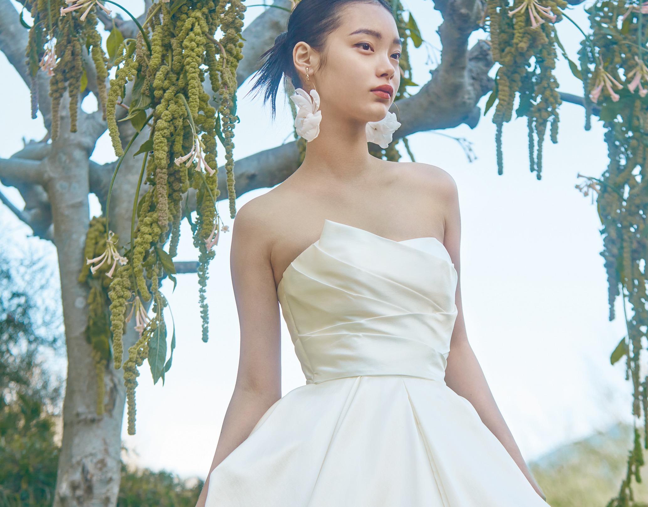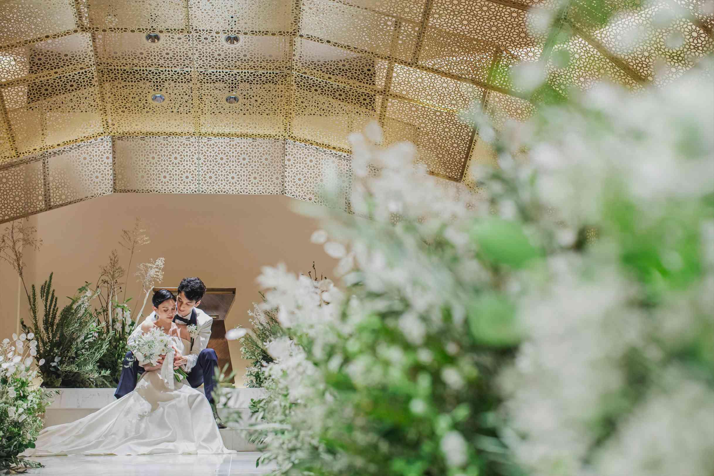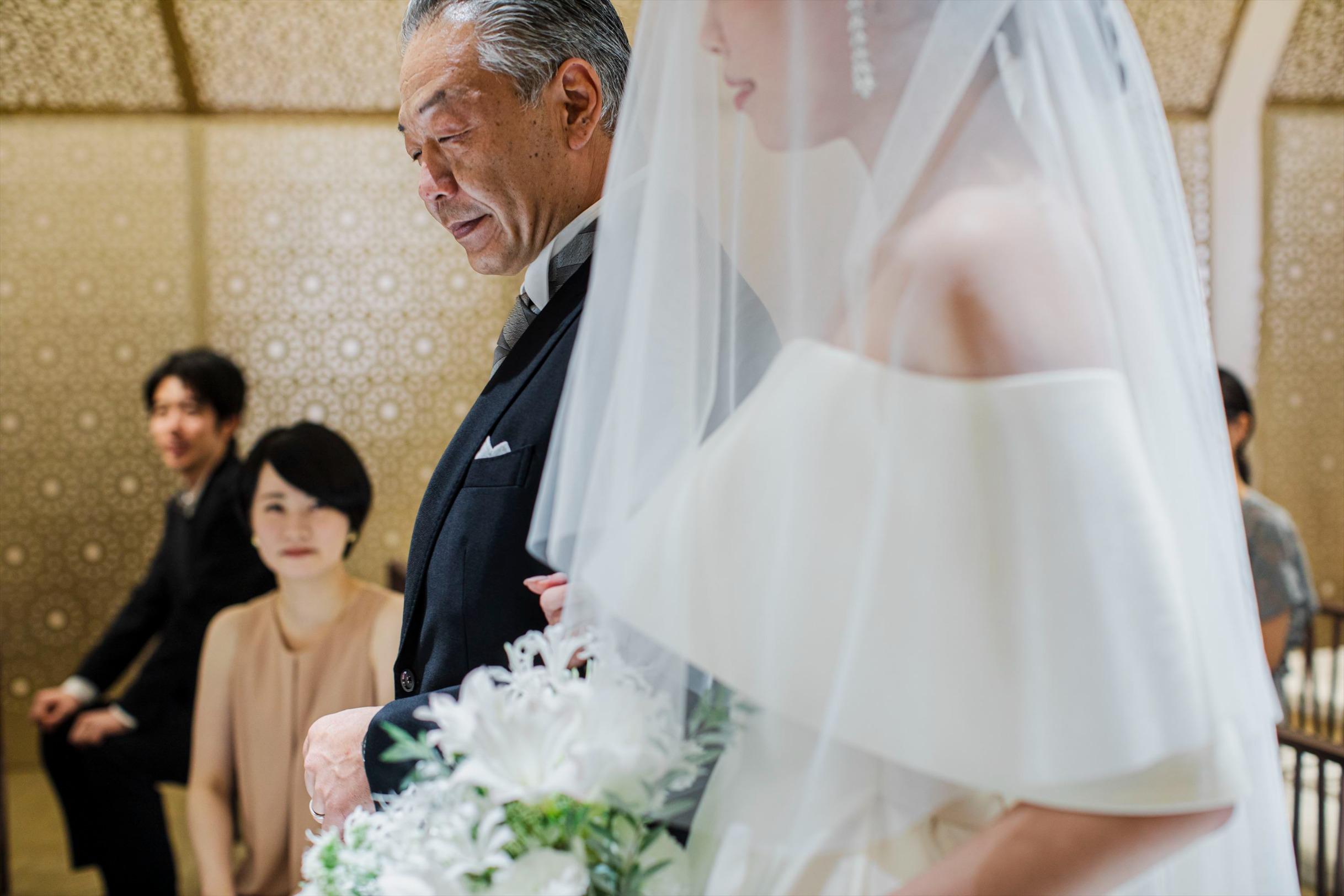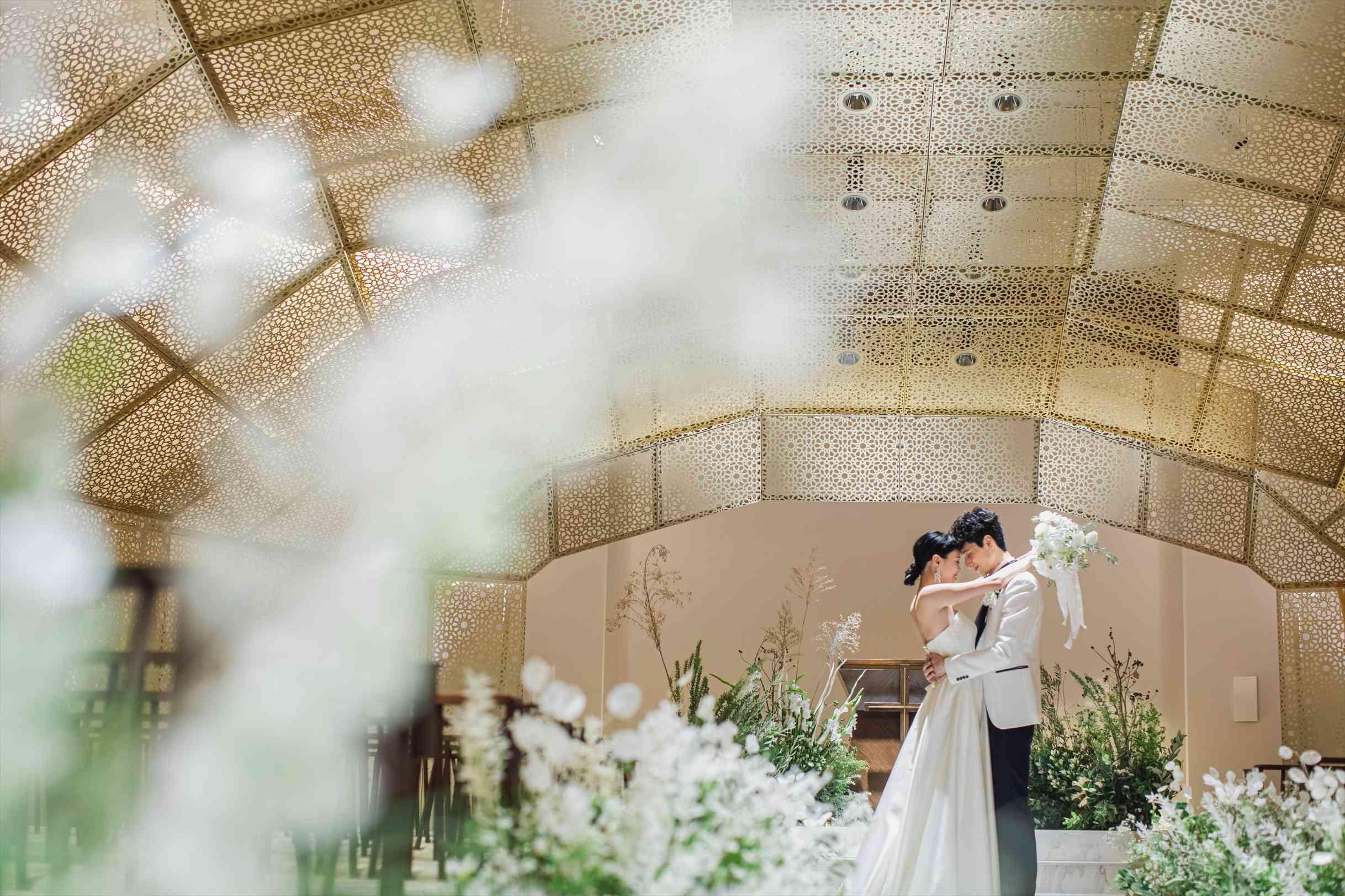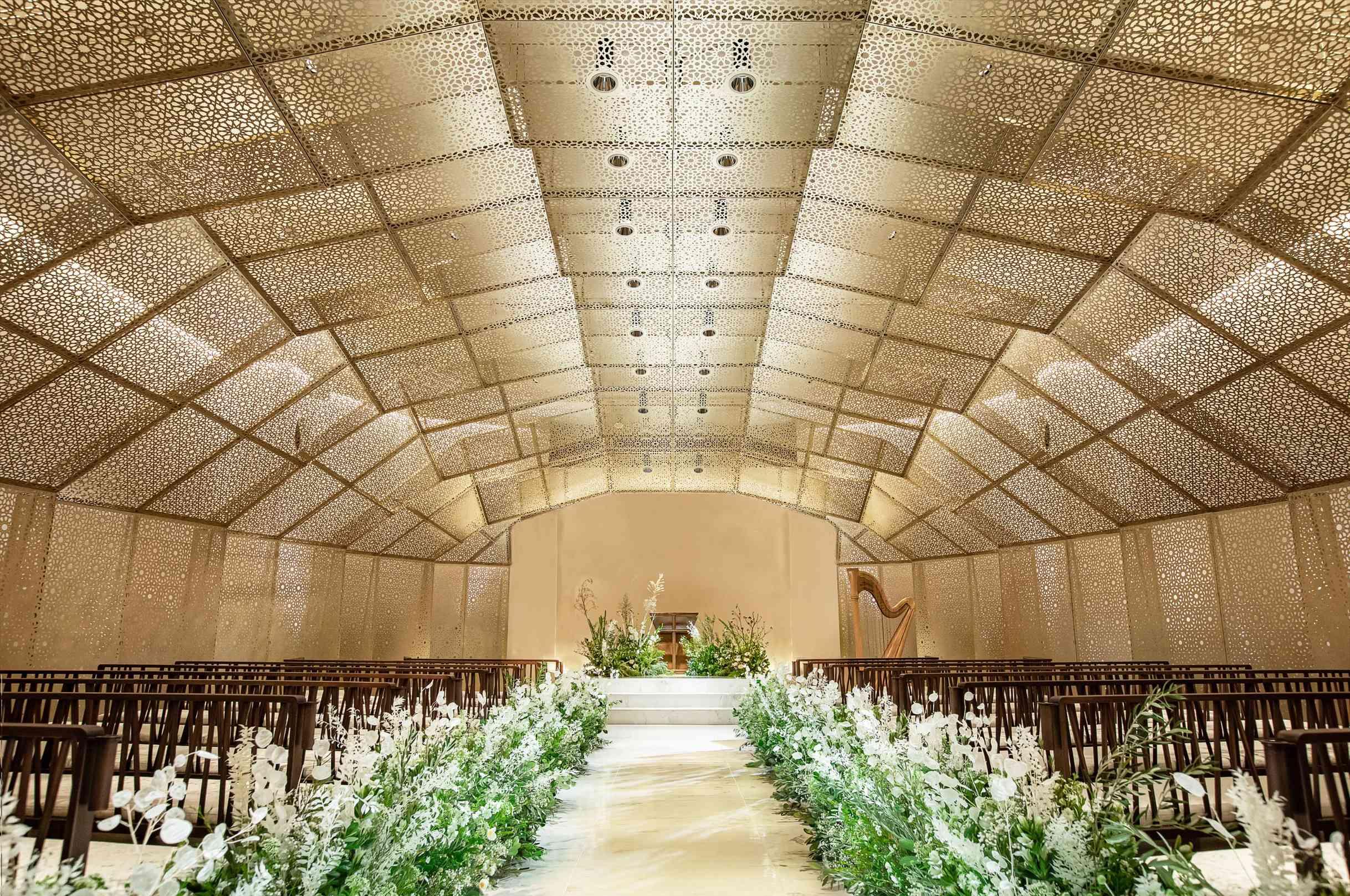 バージンロード15mの上質チャペル。ふたりを優しく包み込むように天井を纏うアーチ型のヴェールはとぎれることのない「永遠の愛」を象徴。祭壇に向かって段を描くデザインは過去・現在・未来のステップを表現