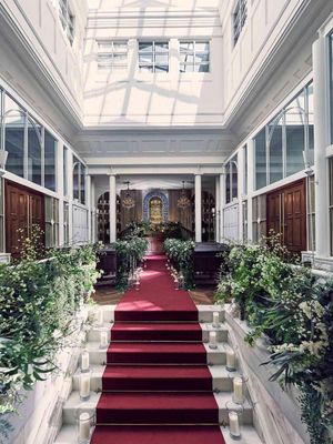 旧露亜銀行時代より守り継ぐ22段の大理石大階段は、そのまま深紅のバージンロードに。長いバージンロードをゆっくりと歩む入場シーンは、家族の絆を深めるとともに、参列するゲストにとっても忘れられない感動的なセレモニーの幕開けとなります。