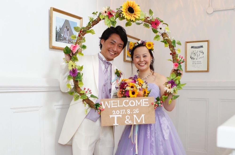 一棟貸切で装飾などが自由の為、ゲスト通路にはご両親の結婚写真を飾るなどアレンジされました。手作りのウェルカムボードも存在感抜群!