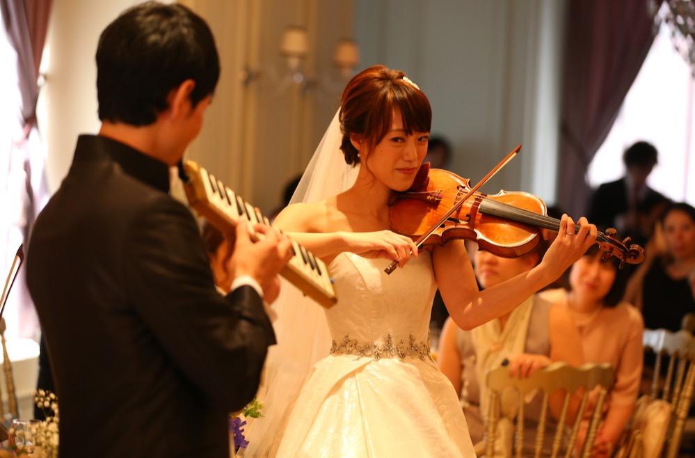 披露宴の演出や入場シーンなどに楽器演奏を取り入れてお二人にしか出来ない素敵な結婚式となりました。