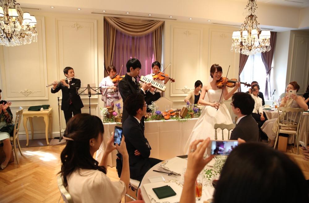 ゲスト皆様も音楽関係の為、音の反響が綺麗な披露宴会場を利用して演奏会のような素敵な披露宴に。演奏しながら入場するなど多彩な演出をなさいました。