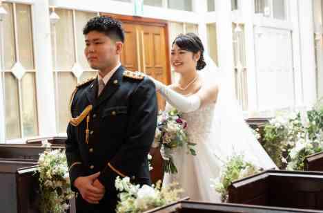 おふたりの結婚式の日は、心地よく晴れた吉日。 ウェルカムスペースにはラ・バンク・ド・ロアで撮影した前撮りの写真をメインに飾り付けされました。 たくさん試着して出会ったピンクのスパンコールが刺繡されたのウェディングドレスと、警察礼服に身を包んだおふたり。 初めて当日のお互いの姿を見せ合い、思わず涙が溢れる感動的なファーストミートとなりました。