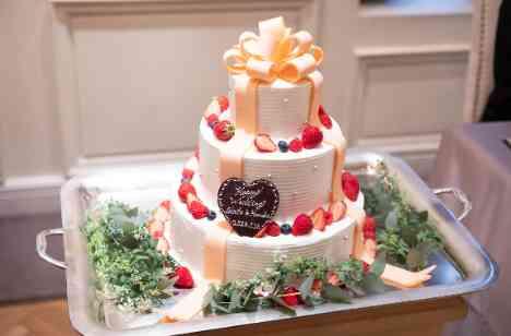 チョコレートコスモスとラナンキュラスのシックな雰囲気に、ピンクや白いお花を組み合わせて上品さを演出。 ゲストテーブルはビンテージの燭台とキャンドルで会場に合ったクラシックな印象に。 ペーパーアイテムはゴールド×ブラウンで大人っぽいデザイン。 専属パティシエが一つひとつ手作りにてご提供するウェディングケーキは、3段のプレゼントボックスのような華やかなケーキにチョコプレートが添えられました。