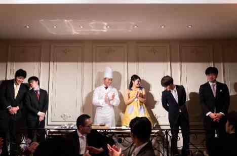 中座後、シェフの姿にお色直しをして再入場されたおふたり。驚くゲストの皆様。 新婦様はカラードレスの上から大好きなちいかわのエプロンをご着用いただきました。 新郎様がローストビーフをカッティングして新婦様がソースをかけてメインディッシュを完成させます。 そして、お世話になっているゲストへ手渡しをするおもてなしの演出。 予想外のサプライズにゲストもとても喜んでくださいました。