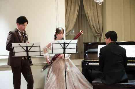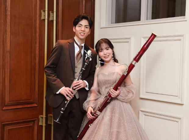 ご披露宴後半では、新郎様・新婦様がそれぞれクラリネットとファゴットを演奏され、ゲスト様にはピアノでお手伝いいただき、三重奏をご披露されました。 楽曲は「音の教会」でのオルゴールセレモニーにて使用した曲とリンクさせたものに。 おふたりのお気持ちがこもった生演奏で、会場は優雅な雰囲気に包まれました。