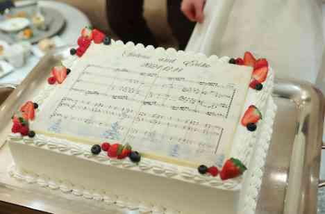 披露宴会場はおふたりがイメージする世界観をフローリストがお花や小物で演出。 ネイビーのテーブルクロスが、LoAの雰囲気にマッチしています。 オープニングムービー上映後ご入場されたおふたり。 まずは新郎様のウェルカムスピーチで、ゲストへの感謝を伝えます。 乾杯のご発声後、登場したのは楽譜をイメージしたウェディングケーキ。 ファーストバイトやサンクスバイトで、和やかで愉しいお時間が続きます。