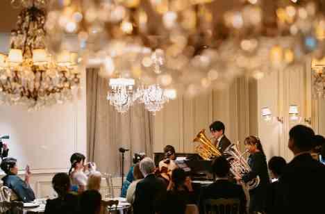 ご披露宴後半では、お色直しをされたおふたりが、メイン料理のローストビーフを仕上げる演出も。 お気持ちのこもった一皿が出来上がりました。 ダンスのご余興やご歓談の後は、新郎様・新婦様がそれぞれユーフォニアムとピアノを演奏され、ゲスト様にもご協力いただき、素敵な演奏をご披露されました。 親御様やゲストの皆様へ感謝のお気持ちをお伝えになられ、おふたりのパーティは結びとなりました。