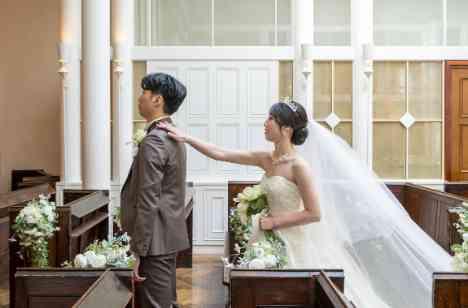心地よい青空が広がる日曜日。 高校の同級生でもあったおふたりのお式が執り行われました。 ご来館後、それぞれお支度を進めるおふたり。 緊張のファーストミートです。 チャペルで背を向けて待つ新郎様の肩をそっと叩いて、ご対面。 幸せそうにハグするおふたり。 挙式前のあたたかいお時間となりました。
