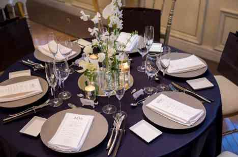 挙式後ご披露宴会場へと皆様をご案内。 ご移動時、館内にはおふたりの高校時代のお写真なども飾っており「おふたりの記念館」にお越しいただいたようなお気持ちでお愉しみいただきました。 ご披露宴会場はネイビーのクロス×ホワイトの装花でシック&上品な雰囲気に。 パーティが始まり、おふたりの恩師より主賓スピーチをいただいたのち、ケーキセレモニーではファーストバイトや抽選でサンクスバイトも行いました。