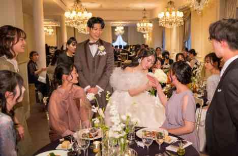 ご披露宴中盤、おふたりはそれぞれのご兄弟にエスコートをお願いし、ご中座されました。 ご衣装のイメージチェンジ後、再入場され、そのまま各テーブルにお写真を撮りにまわるフォトラウンドへ。 おふたり揃って、またお一人ずつでも、ゲストの皆様の元へお話にまわられ、笑顔あふれる和やかなひとときとなりました。