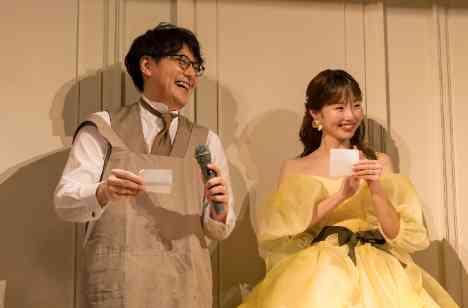 スタイリングを変え再入場されたおふたり。新郎様は自前のエプロンを着用してお肉を持っています。 新婦様はテーマカラーであるレモンイエローのドレス、ヘアスタイルまでこだわったセンスある装いが華やかな会場に映えます。 皆様の前でカッティングしたメインディッシュのお肉はクイズに正解された4名へ贈られました。 ラ・バンク・ド・ロアで人気な演出の1つです。
