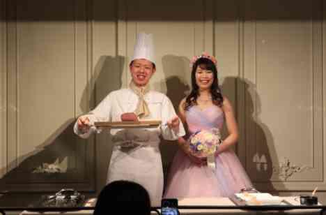 ラ・バンク・ド・ロアでは大人気の演出! 「ローストビーフのカッティングセレモニー」です。 コックコートが抜群に似合うご新郎様! 4名様に向けてお2人でお料理を完成させます。 他にはないオリジナルの演出です。