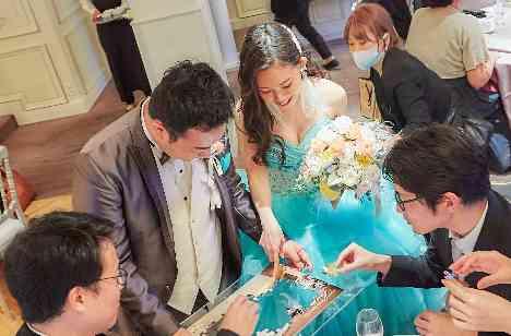 これまですごして来た人生のピースが今のおふたりを創り上げてくれました。パズルは1つ1つのピースが繋がって完成していくもの。 ゲストの皆様にメッセージを書いていただいたピースをおふたりがテーブルごどに回収し大きなパズルが完成いたしました。