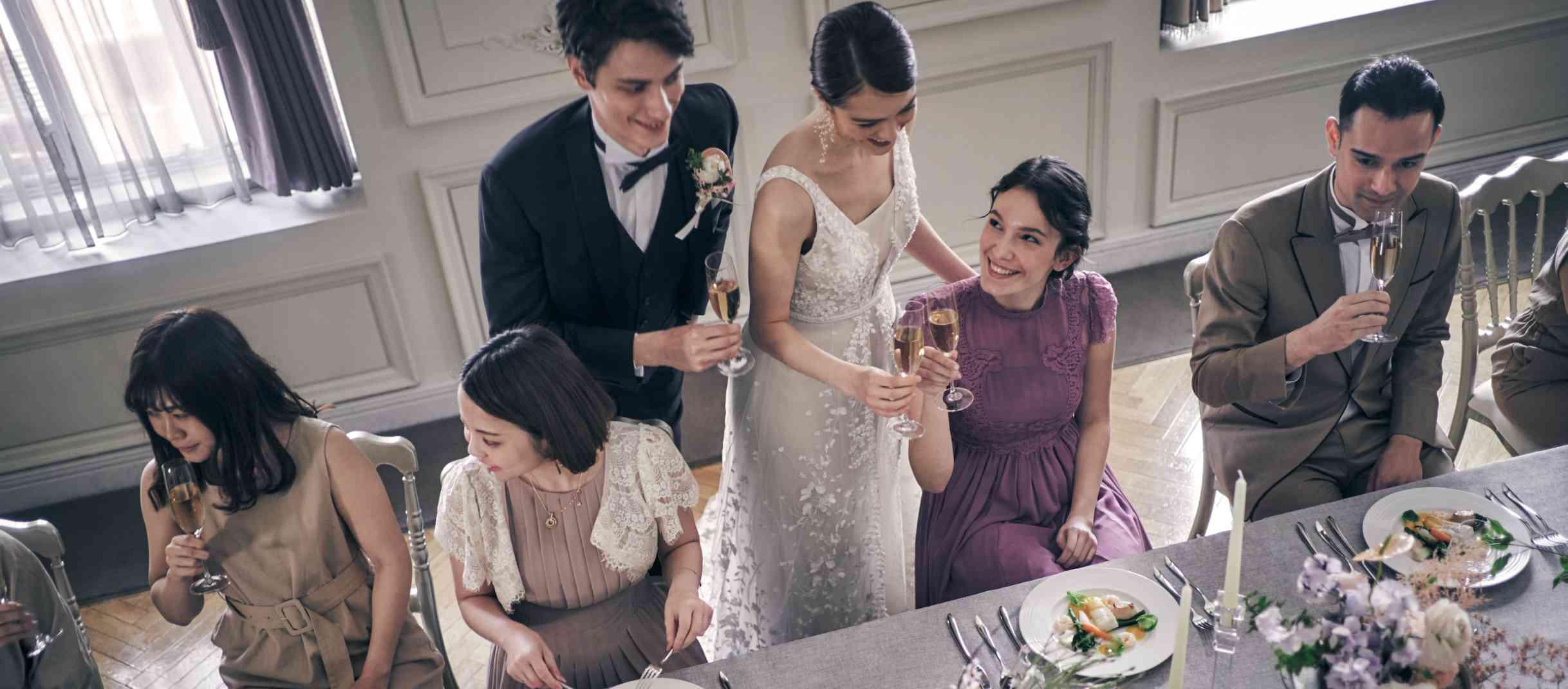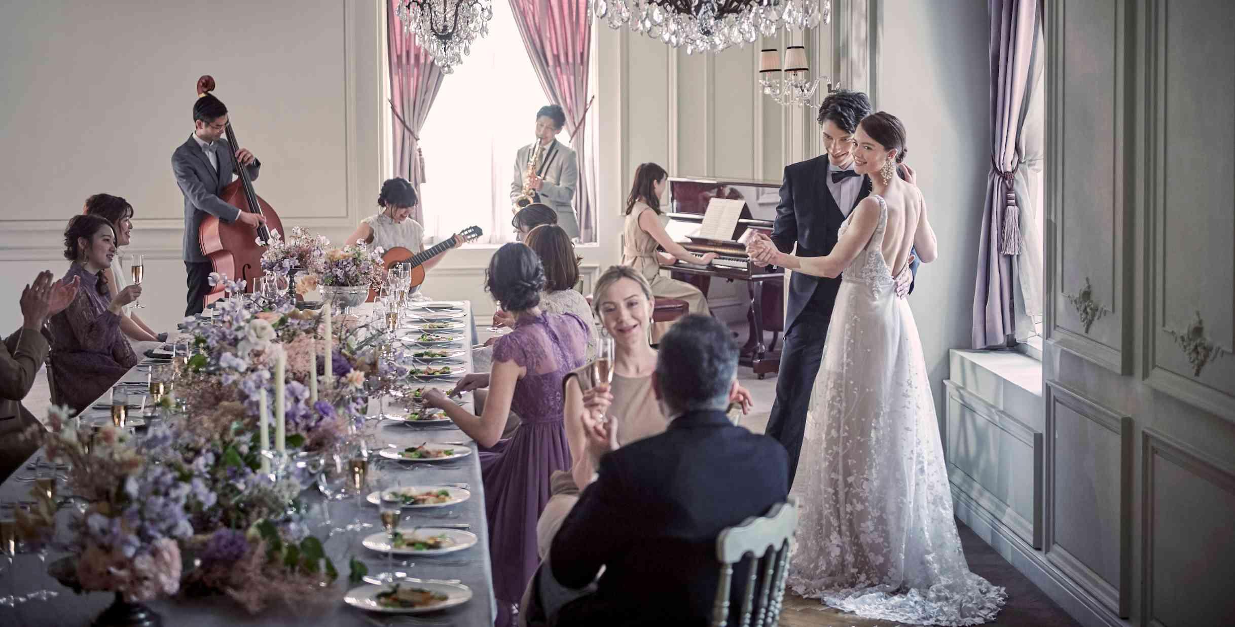 窓から差し込む自然光が会場内を優美な雰囲気で包み、花嫁のドレス姿や装飾をよりいっそう美しく際立たせます。全体に息づくクラシカルな世界観が、優雅な大人のパーティを演出。