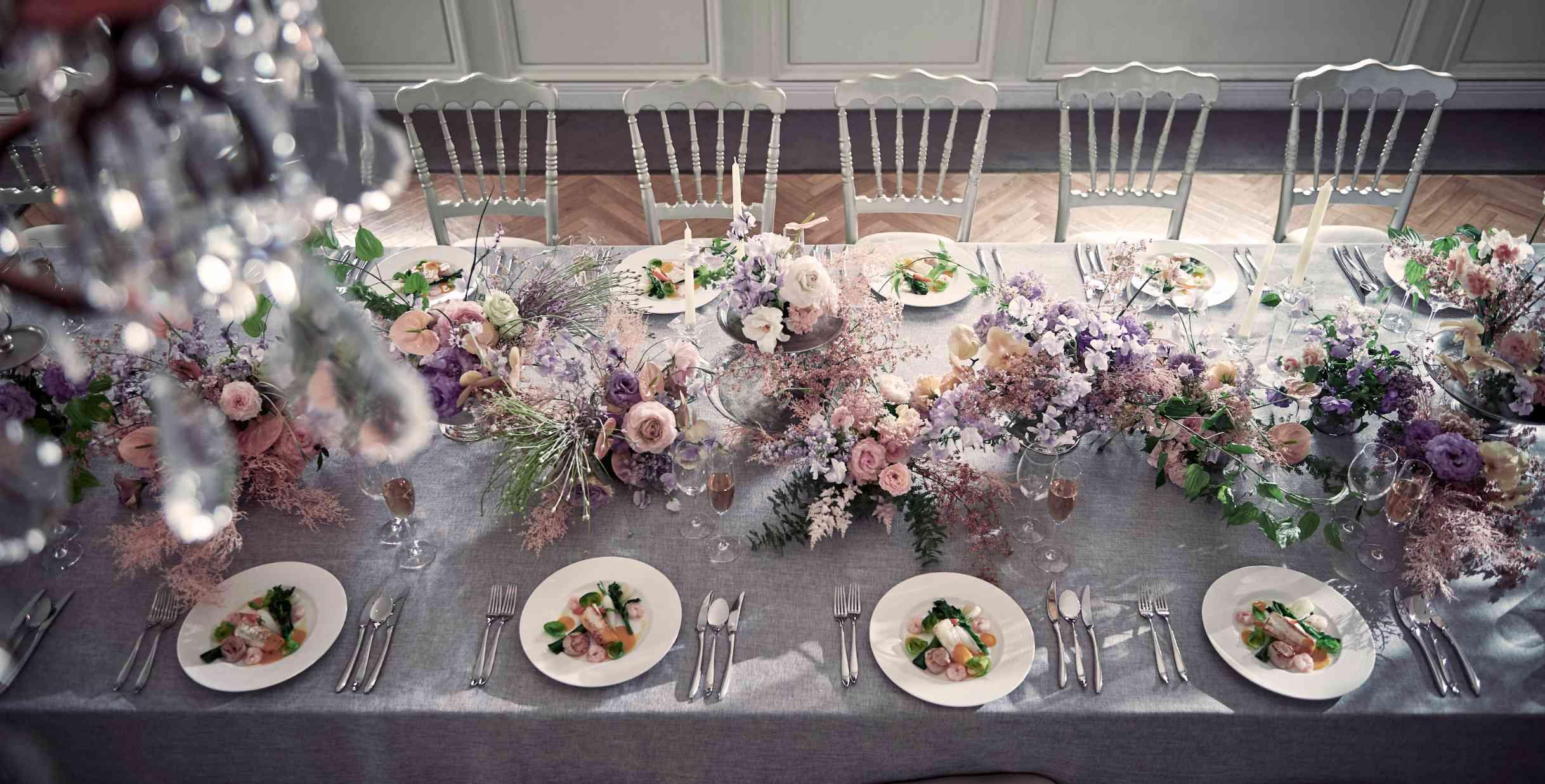 白亜の空間にアンティークのシャンデリアや壁面装飾が気品と温もりを添える披露宴会場「カメリア」。末席の親御様まで近くに感じられるような、自然と視線が中央に集まるデザインでアットホームなパーティを。
