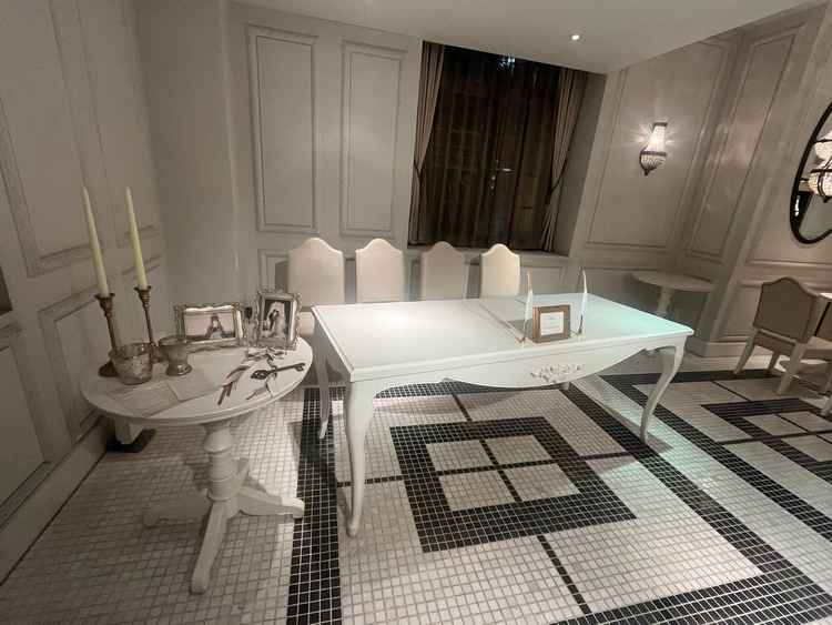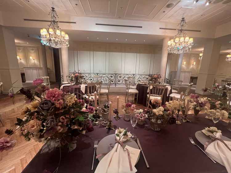挙式会場はクラシカルな雰囲気で素敵でした。 30名程度の挙式を予定してますが、広すぎて寂しい感じにはならなさそうな規模感で丁度良さそうだと感じました。でも天井は高さがあったので狭苦しい感じはなく開放感があって、その点も良いと思いました。 当日は聖歌隊、弦楽器の生演奏があるらしく、天井が高いのでよく響いて神聖な雰囲気を感じられるそうです。 披露宴会場はアンティークで、かといって可愛すぎることもなく上品な雰囲気でとても気に入りました。 シャンデリアや壁の装飾、カーテンのデザインなどが十分施されてるので、テーブルナプキンや装花にそこまでこだわらなくても素敵な雰囲気が演出できて節約できそうとも感じました。
