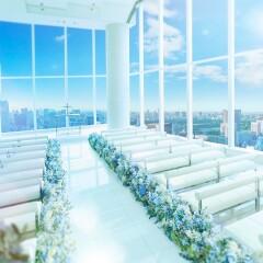【絶景チャペル*模擬挙式体験】地上215mで東京タワーや皇居を一望!ガラス一面から自然光がたっぷりの差し込む天空チャペルで感動の入場体験を。幻想的な夜景が広がるナイトウエディングもお選びいただけます。