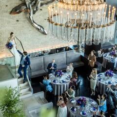 【オープンキッチン付き*パノラマビュー会場】天井高13mの大きな窓から東京タワーや眺望を楽しめるパーティー会場。大人っぽい上質空間での階段入場やオープンキッチンからの料理でワンランク上のおもてなしを。