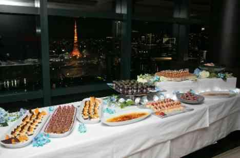 点灯している東京タワーをバックに、こだわりのデザートビュッフェ⋱✮⋰ フィッシュバンク東京オリジナルのデザートにゲストからは、思わず感嘆の声が。「ゲストの皆様に素敵な時間を過ごしていただきたい」というおふたりの思いを乗せたデザート演出。汐留の夜景を楽しみながら、贅沢なお時間をお過ごしいただきました❤