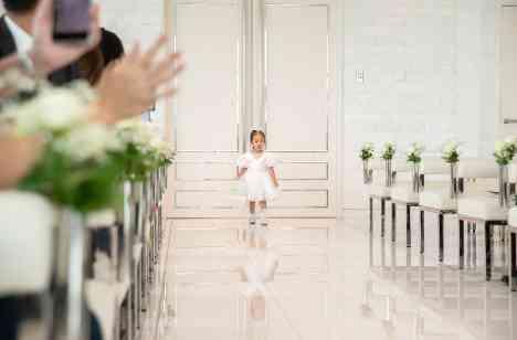 今回リングガールを務めるのはお二人の可愛いお嬢様!可愛いワンピースに身を包み、手にはしっかり指輪の入った籠を持っていました。緊張しながらも、お二人の待つ祭壇へと、一生懸命歩いて向かっていました。可愛らしい姿に、ゲストの顔にも笑顔が溢れ、会場全体が温かい雰囲気に包まれていました。また、ウェディングキスの場面ではお子様をお二人の間に迎えてほっぺにキスをする場面も有り、特別感のある挙式になりました。