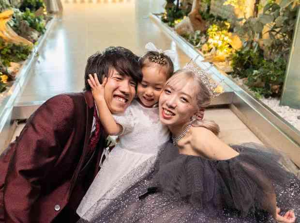 今回リングガールを務めるのはお二人の可愛いお嬢様!可愛いワンピースに身を包み、手にはしっかり指輪の入った籠を持っていました。緊張しながらも、お二人の待つ祭壇へと、一生懸命歩いて向かっていました。可愛らしい姿に、ゲストの顔にも笑顔が溢れ、会場全体が温かい雰囲気に包まれていました。また、ウェディングキスの場面ではお子様をお二人の間に迎えてほっぺにキスをする場面も有り、特別感のある挙式になりました。