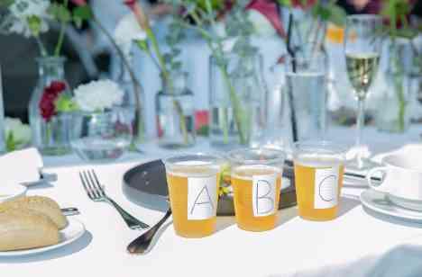 ビールが好きなゲストが多いということで、お二人が選ばれた演出は「ビールの格付け」!3つの異なる種類のビールを銘柄を伏せてテーブルごとに用意し、どれが何の銘柄かをテーブル毎に答える演出です。1番正解数が多いテーブルにはプレゼントも♪ビール好きには腕が鳴る演出ですね!ビールが飲めない方も楽しめるように、サイリウムを使ったドレスの色当てクイズも行い、とても盛り上がっていました!