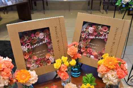 シンプルな世界観がお好きなおふたり。新婦様のお好きな暖色系のお色味でまとめたお花を飾り、オシャレなウェルカムスペースに仕上げました。箱に入っているお花のリースは大切なご友人からの贈り物らしく、メインとして飾りました。