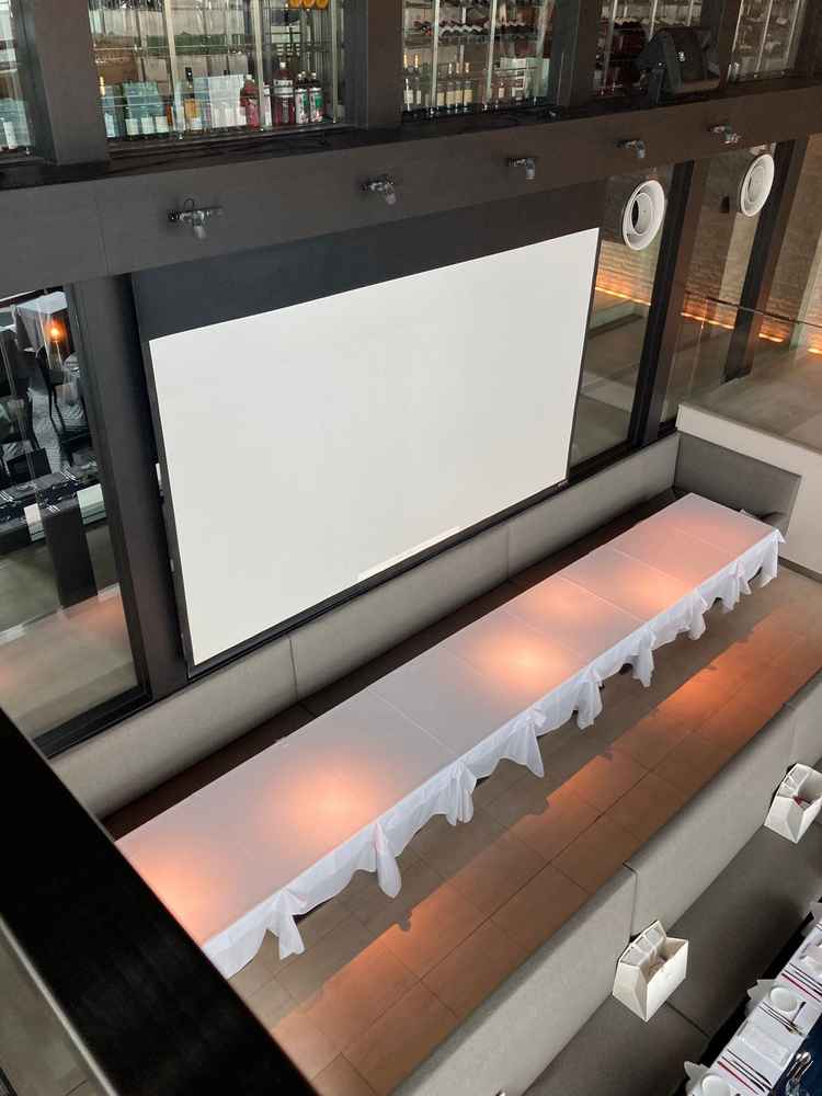 レストラン会場にはめずらしそうな大きなスクリーンがあった。 見学中、音響テストをやっていましたが、問題ない質だと思います。