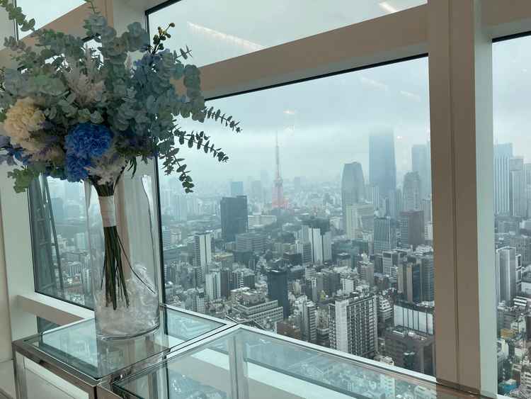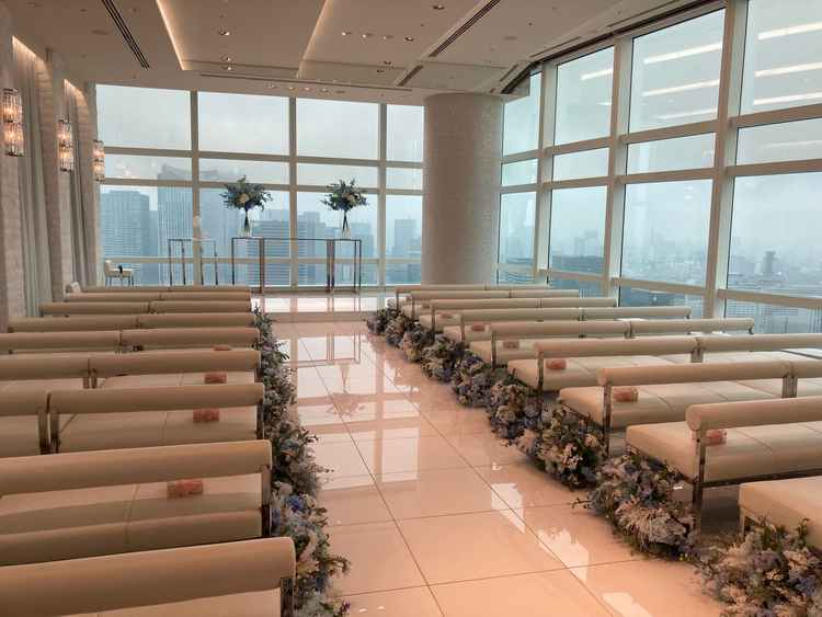 披露宴会場に、ガラス越しの道や階段があり、入場シーンで盛り上がるイメージができた。 元々の空間がおしゃれなため、装花は豪華でなくても良さそう。