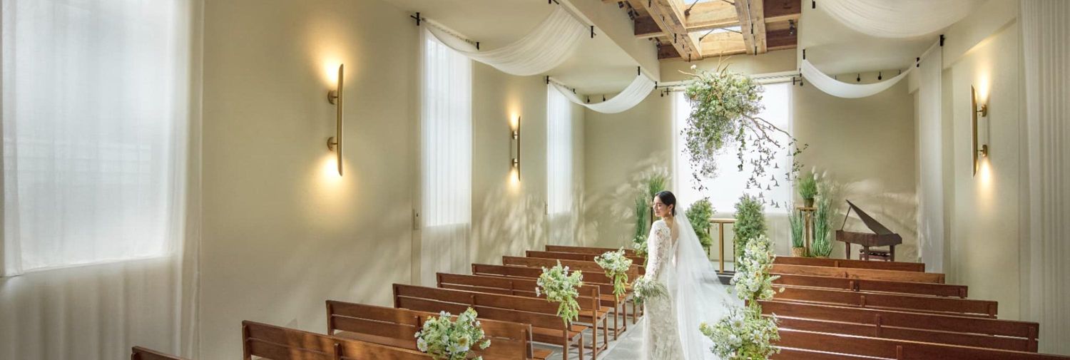 チャペルに差し込む光やなびく影、木の温もり。天窓の光と角度によって色味が変わるバージンロードなど小物を用いず自然そのものが飾りとなり、気を張らない空間が演出できるチャペル。あたたかな誓いのひとときを