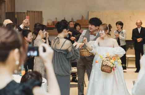 ちょっぴり寂しい気持ちになりがちな退場のシーン。でも、しっとりではなく、「最高!!」という明るい気持ちでパーティーを結べるような退場にしました。明るい雰囲気の退場曲の中、ゲストとハイタッチをしたり、肩を組み一緒に歌ったり…おふたりが好きなフェスのように賑やかな雰囲気に包まれて、この場所にいた全員の思い出に残るひと時となったことでしょう。