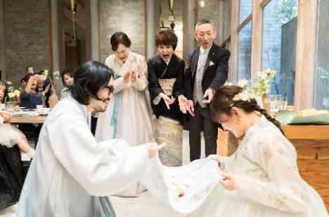 「家族と家族の結びつき」が強い韓国文化を大切に、結婚式の結びには、新郎新婦とお互いのご両親でペベクの儀式を。ペベグは栗とナツメを親御様が投げて、新郎新婦が受け止められた数によって子どもの数がわかるというセレモニーです。本来、韓国では新郎様のご両親のみのようですがお互いの親御様も交わり家族だけの時間を演出。