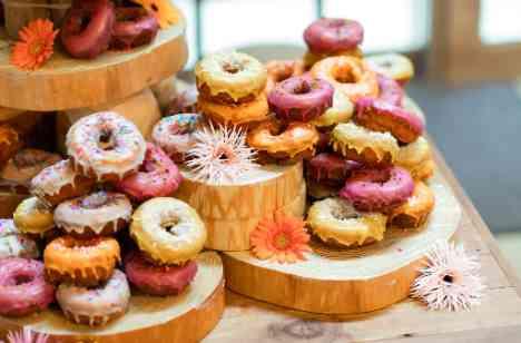 おふたりが通っているドーナツ屋さんで特別にご用意いただいたウェディングドーナツタワー。カラフルな装飾のドーナツにおふたりがかぶりつくのはBIGドーナツ!ゲストの皆様にも思わず笑顔がこぼれます。オープニングからフォトコンテストも実施し、たくさんのお写真が写りだされるスクリーンにおもわず全員が笑顔に!