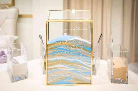 プラネタリウムの演出が1番心に残っています。目を開けた瞬間に星空に包まれ、幻想的でとても素敵でした。 披露宴では夏らしく花火のプロジェクションマッピング入場をしました。迫力があって主役感満載でした!またゲストと一緒に何か作れないかと考え結婚証明書としてサンドアートセレモニーを用意しました。フレームには誓いの言葉が刻まれています。大切なゲストと作った世界に一つだけの結婚証明書は一生の宝物です。