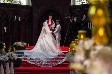 こちらの式場は大きなステンドグラスと赤いバージンロードがとても魅力的なので、それに映えるようなロングベールを用意しました。当日はとても素敵なお写真を沢山撮って頂けて嬉しかったです。また、カサ・デ・アンジェラ青山ならではのプラネタリウム演出やシャワー演出を取り入れることで、ゲストが飽きないように工夫致しました。
