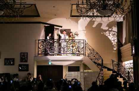 お色直し後の再入場時は大きな螺旋階段からご入場。スポットライトに照らされたおふたりのシルエットが映し出され、まるで映画のワンシーンのようにロマンチックです。ゲストの皆様がシャッターを構えた印象的なシーンです。