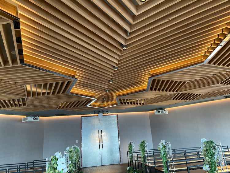 窓が大きく明るいため、雨でも会場内が暗くならずにいいと思います。夫は気にならなかったようですが、私はビル群に囲まれた環境が現実的だなと感じました。