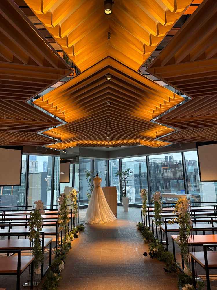 レストランがメインの会場であるため、挙式会場はこぢんまりとした印象でしたが、2面採光と天井の寄せ木細工が素敵でした。