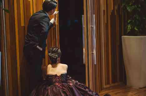 当日までひみつにしていたウエディングドレスはファーストミートでお披露目。これまでの事を想い返しながら、一歩一歩新郎様の所へ歩んでいただきました。 肩をたたき、振り向いた新郎様は笑顔でハグ!まるで海外映画のような素敵なワンシーンでした。 その後はお互いにご用意されていたお手紙を読んで、挙式前のおふたりだけの大切な時間を過ごしていただきました。