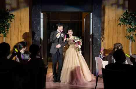 正解だと思うカラーのペンライトを、ゲスト全員に1本ずつお持ちいただきました。 おふたりが選んだ音楽に合わせて、ノリノリで入場するおふたり。カラードレスのカラーは…ベージュ!!! オフショルダーの部分がボリューミーで、何層ものチュールは絶妙に色の違うベージュが重なっているんです。ノートルダムでも大人気のこのカラードレス。 ゲストからも「かわいい~♡」が止まりませんでした。