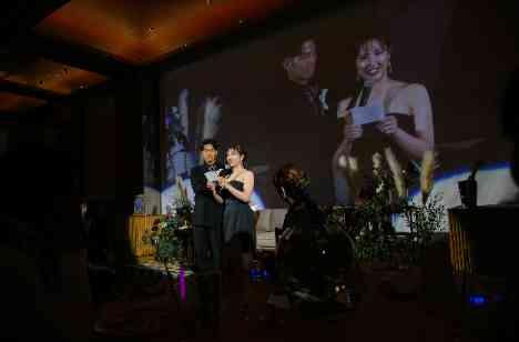 披露宴のクライマックスである「花嫁の手紙」のシーン。 その感動的なシーンを、よりゲストに印象付けるためにお手紙を読んでいるおふたりの姿を後ろの巨大スクリーンへライブカメラで映し出しました。 どこのお席に座っていてもおふたりの姿がしっかりと見え、おふたりの表情が手に取る様にわかりました。 家族へ感謝の気持ちを伝えたいと仰っていたおふたりにはぴったりな演出となりました。