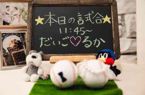 おふたりの大好きなわんちゃんと野球がテーマのご結婚式!愛犬は前撮りにももちろん参加し当日ゲストにもご覧いただきました♪ゲストをお迎えするウェルカムスペースには前撮りのお写真と野球をイメージした飾り付け!披露宴開始時間は野球にちなんで試合開始時間と表記しました♪芝生の上の野球ボールは蝶ネクタイとベールを付けてご結婚式っぽく装飾!